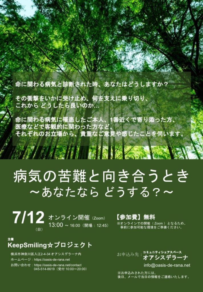 生きる力となるのは希望をもつこと 7月12日にzoomでイベントを開催しました 「病気の苦難と向き合うとき」あなたならどうする? という表題です 最初はリアル開催の予定でしたが コロナの問題もあり 延期・延期となり オンライン開催となりました 結果、... -